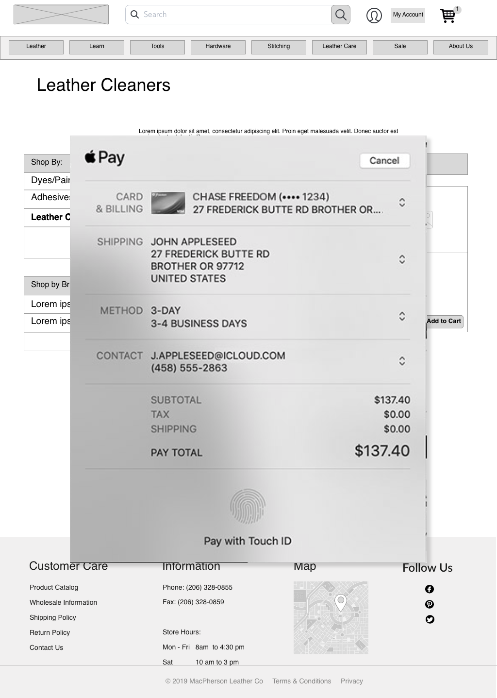 Lauren spills coffee on her retro-chic soft leather bag and she knows that water and soap is harmful to leather. She goes to MacPherson Leather Company’s website to pick out a leather cleaner with intent to purchase a cleaner and checkout.