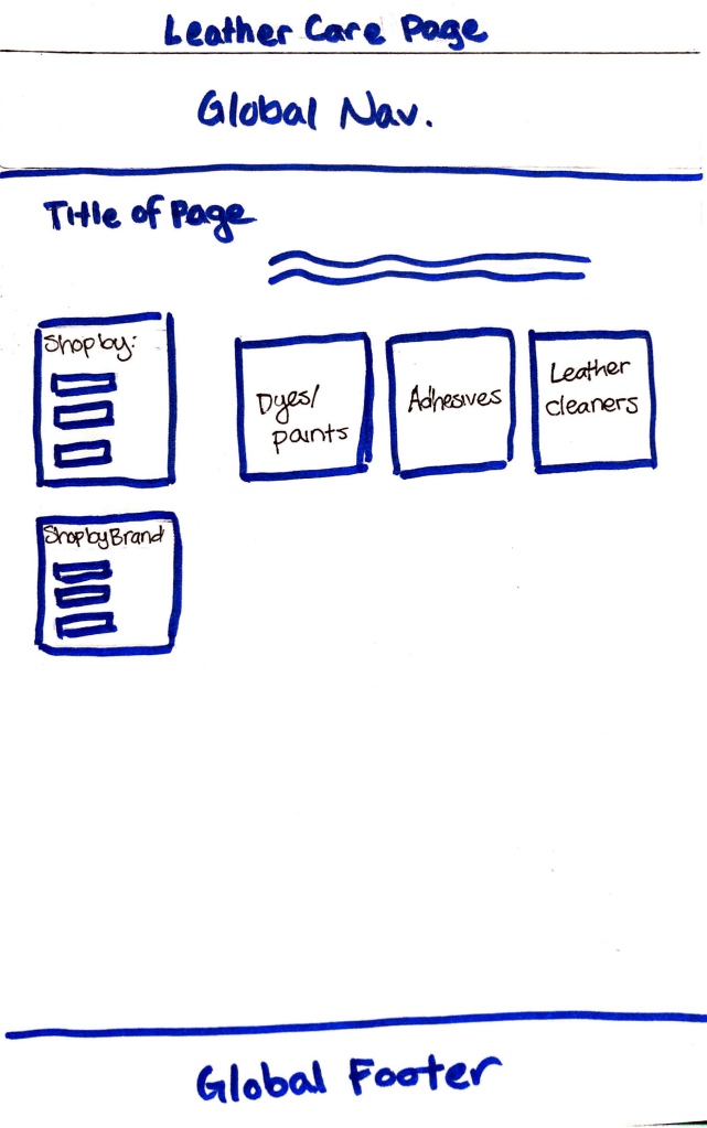 When I was comfortable with the ideation I made in sketching, I created digital wireframes of the pages I needed for Lauren’s user task flow. These pages included: Landing Page, Leather Care, Leather Cleaners, Cart, and the checkout process.