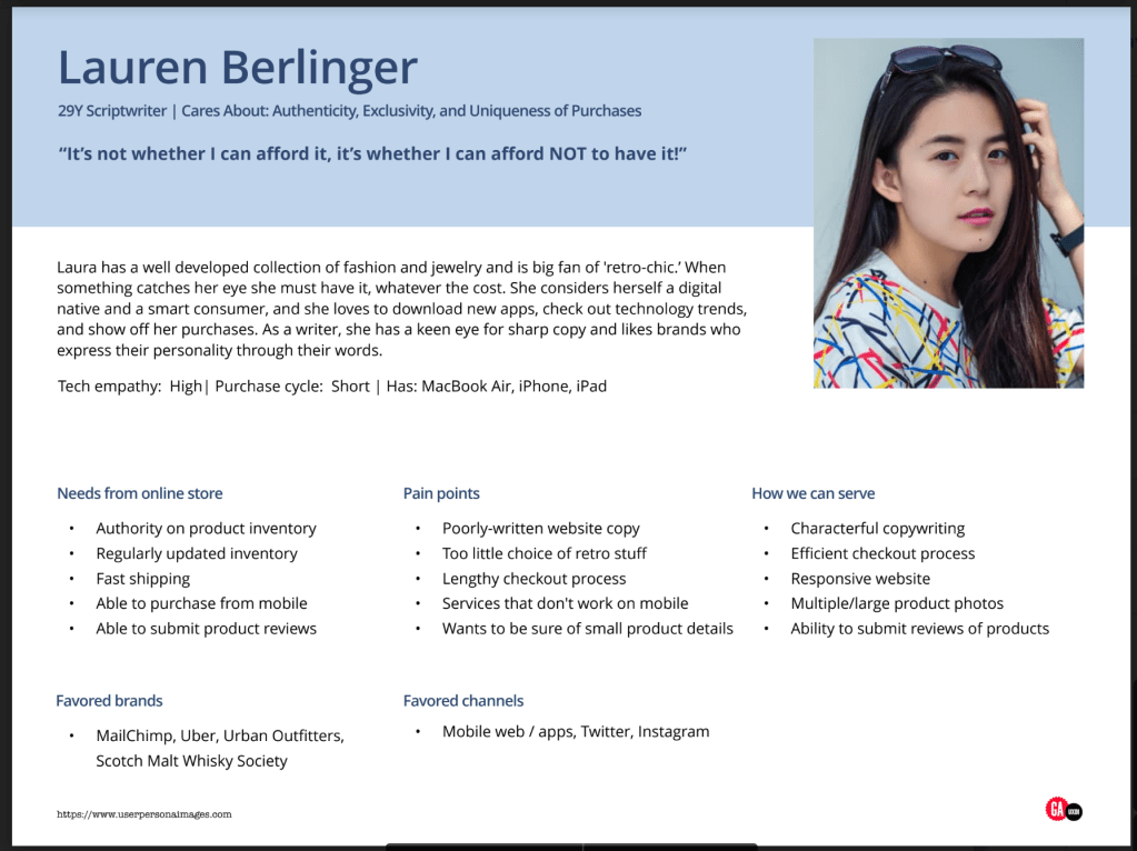 In this project, I was designing for Lauren Berlinger, a young technologically-native copywriter who is a big fan of ‘retro-chic’ and makes purchases on the web regularly. Designing for Lauren guided my design process and influenced the way I approached this project.