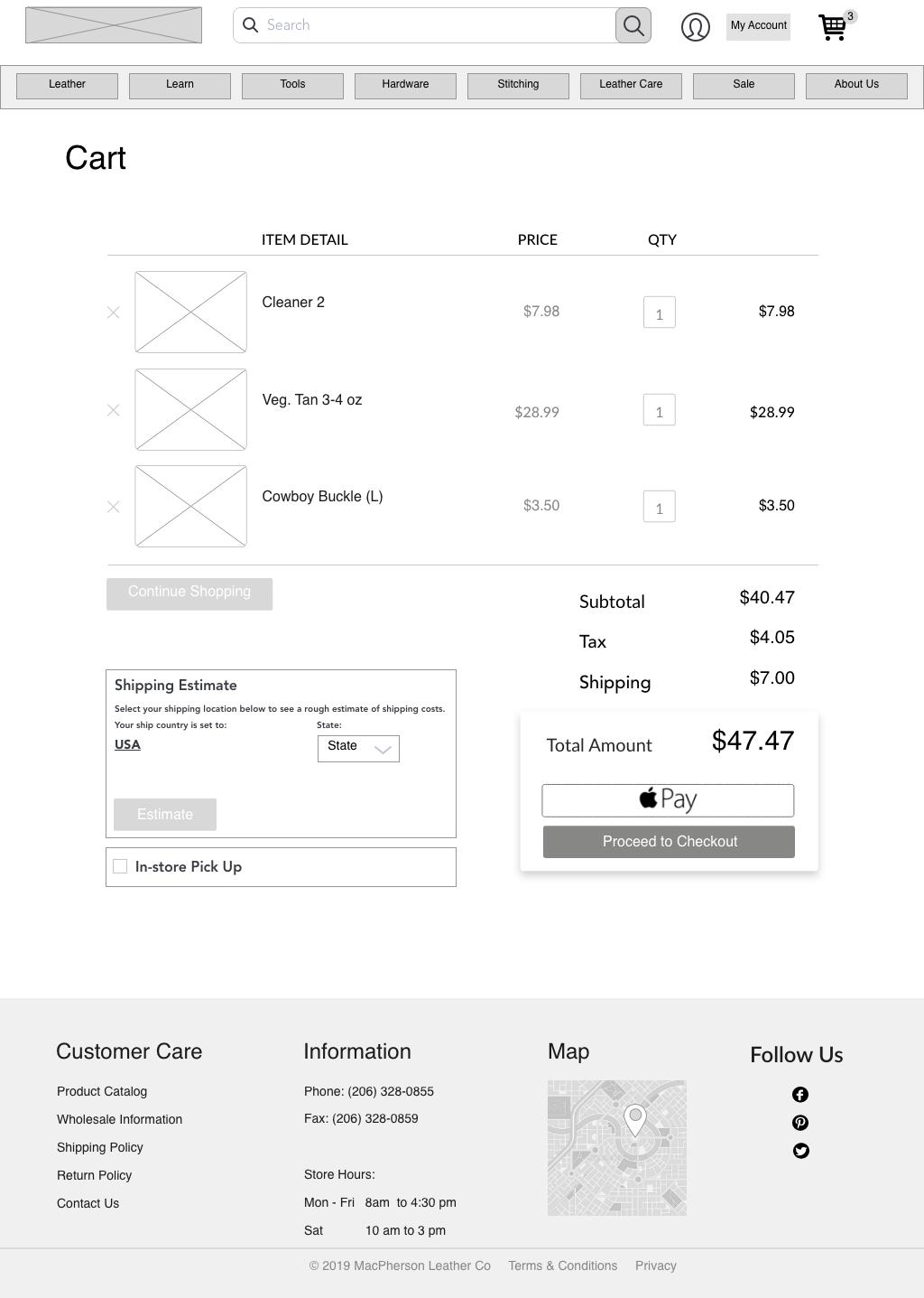 During my time as a General Assembly UX Design Immersive student, I worked through the UX design process from user research to mid-fidelity mockups over two weeks to redesign MacPherson Leather Company’s website, focusing on the eCommerce system.