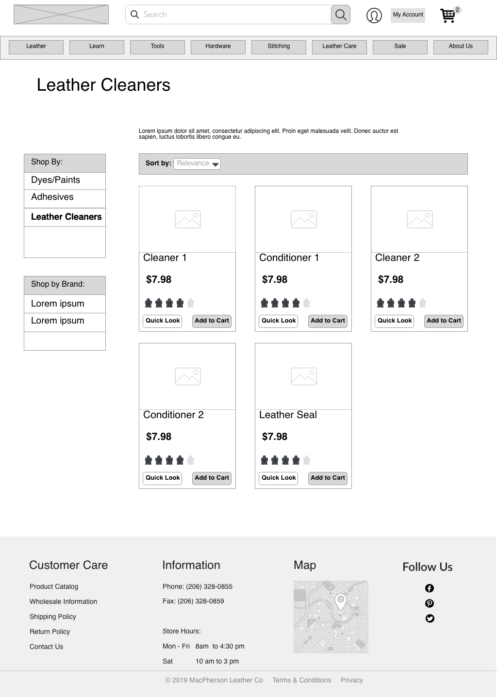 When I was comfortable with the ideation I made in sketching, I created digital wireframes of the pages I needed for Lauren’s user task flow. These pages included: Landing Page, Leather Care, Leather Cleaners, Cart,and the checkout process.