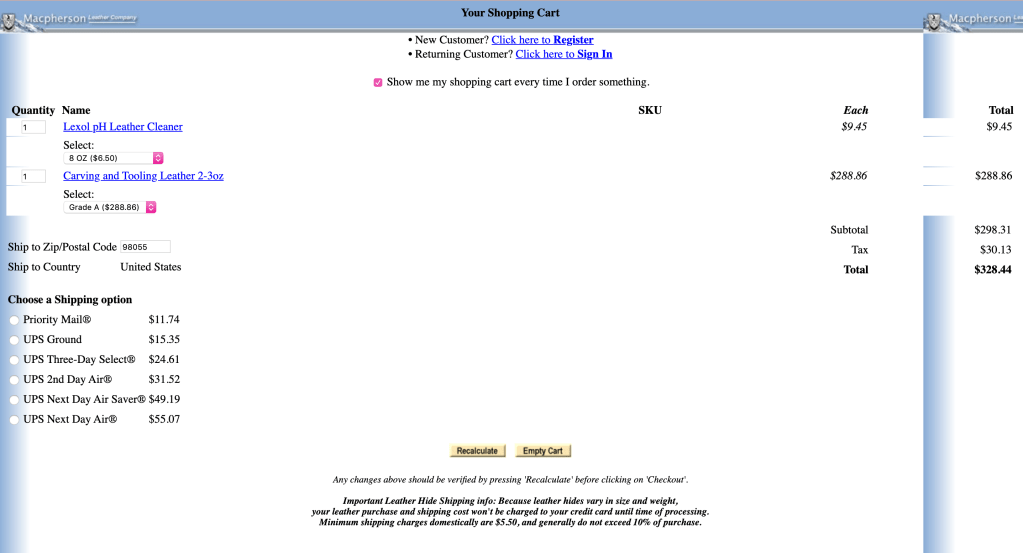 Lauren spills coffee on her retro-chic soft leather bag and she knows that water and soap is harmful to leather. She goes to MacPherson Leather Company’s website to pick out a leather cleaner with intent to purchase a cleaner and checkout.